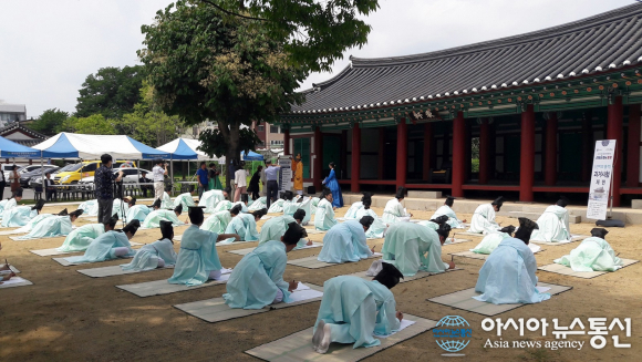 | 15일 창원시 마산합포구 진해현 관아 동헌과 삼진중학교에서 열린 창원국악관현악단 주관, ‘선비문화와 풍류’ 과거시험 재현 행사 장면.(사진제공=창원시청) |