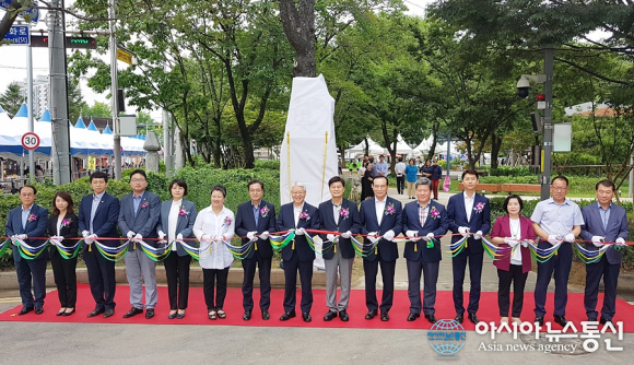| 27일 세종시 조치원 구 정수장에서 문화정원 조성공사 준공식이 열렸다. 이날 준공식에는 이춘희 시장, 김중로 국회의원, 서금택 시의장과 박성수 박용희 손인수 손현옥 이태환 차성호 시의원, 류정섭 부교육감, 한상운 문화원장 등이 참석했다. 참석자들이 준공 테이프를 자르고 있다./아시아뉴스통신=홍근진 기자 |