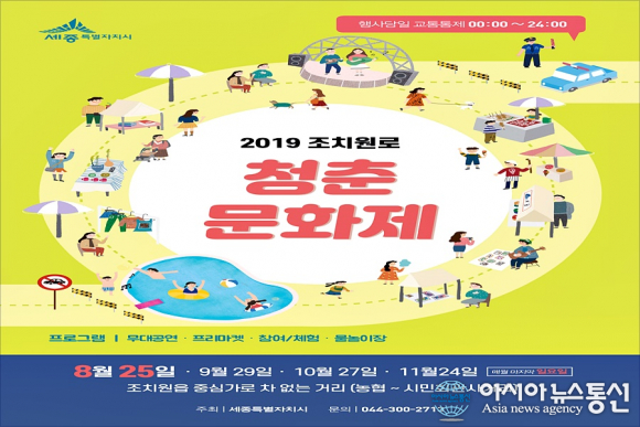 세종시는 오는 25일부터 오는 11월까지 매월 마지막주 일요일 조치원읍 중심가로를 차 없는 거리로 만들고 이 곳에서 청춘문화제 행사를 개최한다고 20일 밝혔다.
