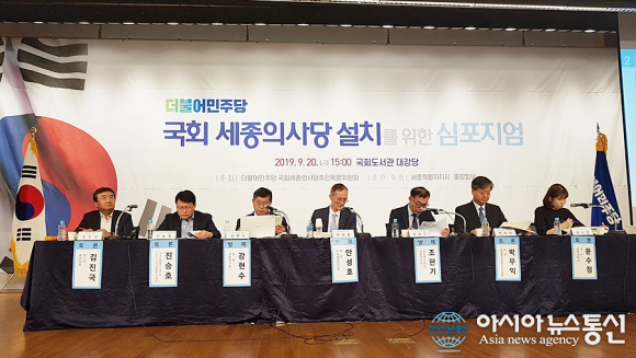 | [아시아뉴스통신=홍근진 기자] 20일 국회도서관 대강당에서 열린 국회 세종의사당 설치를 위한 심포지엄에서 참석자들이 발제 및 종합토론과 질의응답을 벌이고 있다. |