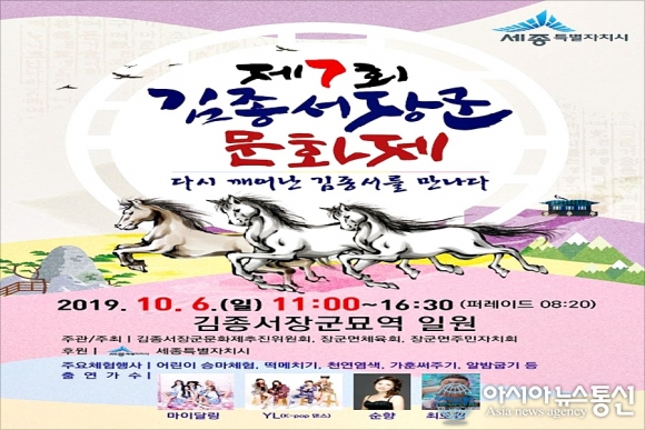 [아시아뉴스통신=홍근진 기자] 세종시는 오는 6일 세종대왕 시절 6진 개척의 업적을 남긴 김종서 장군을 기리는 제7회 김종서장군문화제가 장군의 묘역 일원에서 열린다고 3일 밝혔다.