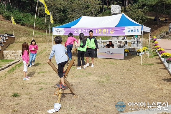 | [아시아뉴스통신=홍근진 기자] 세종시 장군면이 6일 세종축제를 맞아 세종대왕 시절 6진 개척의 업적을 남긴 김종서 장군을 기리는 제7회 김종서 장군 문화제를 장군의 묘역 일원에서 개최한 가운데 어린이들이 외줄 건너기 무료 체험을 하고 있다. |