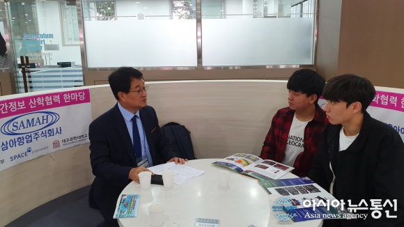 | 대구과학대학교가 8일 글로벌 강의실에서 개최한 '드론과 디지털트윈을 선도하는 공간정보 핵심전문인력양성 심포지엄' 부대행사인 '공간정보 산학협력 한마당-일자리 창출Zone'에서 취업상담이 이뤄지고 있다.(사진제공=대구과학대) |