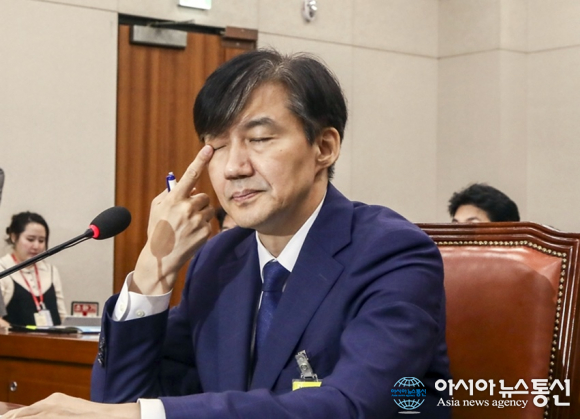 | 조국 법무부장관 후보자가 지난달 6일 서울 여의도 늦은 저녁 국회에서 열린 인사청문회에서 피곤한듯 눈을 만지고 있다. /아시아뉴스통신=윤의일기자 |