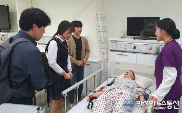 | 대구과학대학교에서 진행된 2020학년도 수시1차 모집 면접에서 간호학과 재학생이 면접 응시생들에게 학과 실습기자재에 대해 설명하고 있다.(사진제공=대구과학대) |