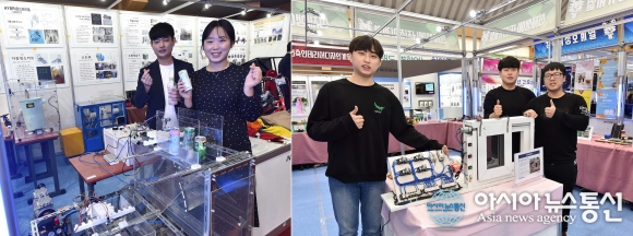 | 왼쪽은 '지구를 살리자(Auto Recycler, 쓰레기 자동분리기)' 작품을 제작한 박준형(왼쪽), 이예리 학생이 작품에 함께 한 모습, 오른쪽은 손승찬.강맹성.윤윤재(신재생에너지전기계열, 왼쪽부터) 학생이 공동 제작한 '스마트윈도우' 작품을 배경으로 파이팅을 외치고 있는 모습.(사진제공=영진전문대) |