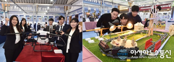 | 왼쪽은 전자정보통신계열 학생들이 드론을 배경으로 파이팅을 외치는 모습, 오른쪽은 신재생에너지전기계열 학생들이 태양광발전 작품인 '태양관테마파크'를 살펴보고 있는 모습.(사진제공=영진전문대) |
