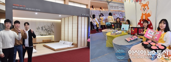 | 왼쪽은 호텔 한실(韓室) 시공에 참여한 오중근, 김세용, 김나영 학생이 작품을 배경으로 파이팅을 외치는 모습, 오른쪽은 유아교육과 학생들이 유아용 교재교구를 펼쳐 보이고 있는 모습.(사진제공=영진전문대) |