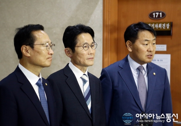 | 29일 국회 오전 국회정론관에서 더불어민주당 전 원내대표 홍영표의원, 바른미래당 김관영 의원, 정의당 윤소하 원내대표가 정치,사법개혁을 위한 페스트트랙 관련법안을 조속히 처리해야한다고 주장하고있다./아시아뉴스통신=윤의일기자 |