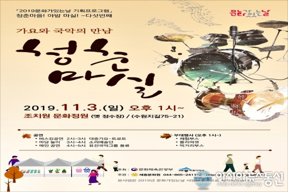 세종시는 다음달 3일 조치원 문화정원에서 '청춘마을 야밤마실' 다섯 번째 문화가 있는 날 행사로 신나는 가요와 국악 한마당 잔치를 연다고 31일 밝혔다.