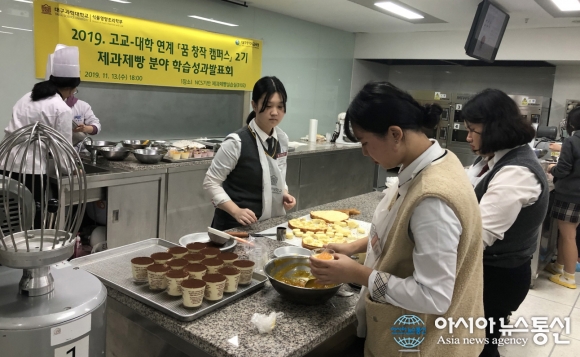 | 대구과학대학교 식품영양조리학부 실습실에서 13일 실시된 '2019 꿈 창작 캠퍼스 2기 성과발표회'에서 일반고 학생들이 공개 수업을 하고 있다.(사진제공=대구과학대학교) |