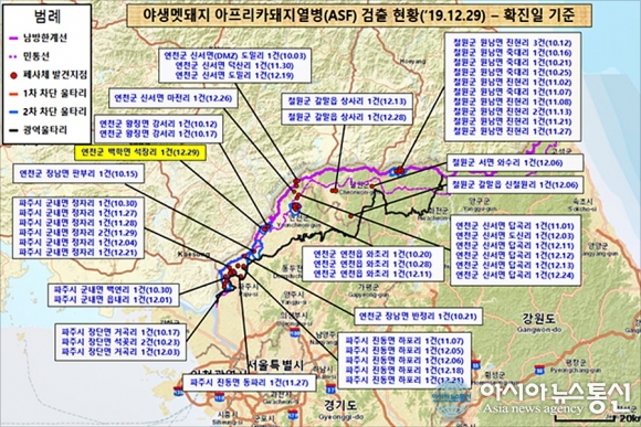 [아시아뉴스통신=홍근진 기자] 환경부는 국립환경과학원이 경기도 연천군 백학면 석장리에서 발견한 멧돼지 폐사체에서 아프리카돼지열병(ASF) 바이러스가 검출됐다고 29일 밝혔다.