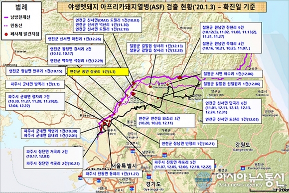 과학원은 3일 폐사체에서 아프리카돼지열병 바이러스를 확진하고 결과를 관계기관에 통보했다. 이로써 연천군에서 20번째로 멧돼지 아프리카돼지열병이 확진됐으며 전국적으로는 57건이 됐다.
