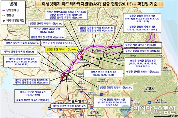 과학원은 5일 폐사체에서 아프리카돼지열병 바이러스를 확진하고 결과를 관계기관에 통보했다. 이로써 연천군의 야생멧돼지 아프리카돼지열병 확진은 21건이 됐으며 전국적으로는 59건이 됐다.
