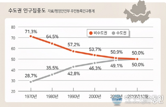 | 지난 2일 행정안전부가 발표한 주민등록인구 통계. 수도권 인구가 50.001%를 차지했다.(사진=행안부) |