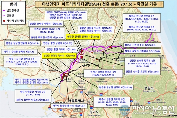 이로써 연천에서는 24건의 야생멧돼지 아프리카돼지열병이 확진됐으며 전국적으로는 62건이 됐다.