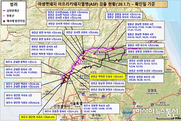 정원화 생물안전연구팀장은 "이번 폐사체는 모두 민통선 내 2차 울타리 내에서 발견된 것으로 이 지역에서는 감염된 폐사체가 더 나올 수 있어 수색을 강화하겠다"고 말했다.
