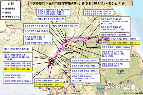 [아시아뉴스통신=홍근진 기자] 환경부는 국립환경과학원이 경기도 파주시와 강원도 화천군 민통선 안에서 모두 3마리(파주2 화천1)의 아프리카돼지열병(ASF) 바이러스 감염 멧돼지 폐사체를 발견했다고 11일 밝혔다.