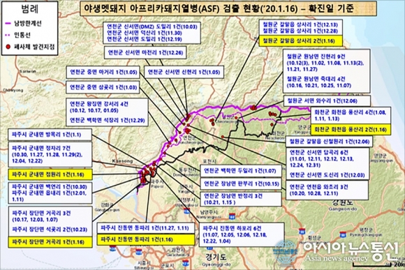 이로써 지금까지 ASF 바이러스 감염 멧돼지 확진은 파주시가 총 27건, 화천군은 7건, 철원군은 19건으로 나타났으며 전국적으로는 81건이 됐다.
