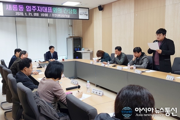 | 세종시 새롬동 복합커뮤니티센터 회의실에서 열린 입주자대표 간담회에서 새뜸마을12단지 복헌규 회장이 싱싱장터를 새롬동에 원안대로 추진해야 한다고 주장하고 있다./아시아뉴스통신=홍근진 기자 |