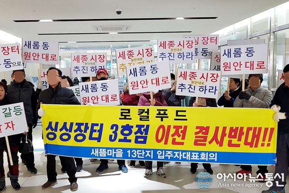 [아시아뉴스통신=홍근진 기자] 세종시 새롬동 주민들이 21일 새롬동 복합커뮤니티센터에서 열린 이춘희 시장과 입주자대표와의 간담회에 앞서 '싱싱장터 3호점을 원안대로 시행하라'며 시위를 벌였다.