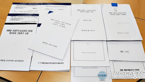 | 세종시가 당초 새롬동에 짓기로 했던 싱싱장터 3호점을 다정동으로 옮기려는 문제를 놓고 21일 새롬종 복합커뮤니티센터에서 열린 이춘희 시장과 입주자대표와의 간담회에 앞서 주민들이 원안사수를 위해 작성한 연대 서명부를 책상 위에 진열해 놓고 있다./아시아뉴스통신=홍근진 기자 |