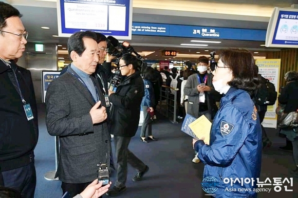 정 총리는 먼저 인천공항검역소장으로부터 신종 코로나바이러스 감염증 검역상황을 보고 받고 제1여객터미널 검역대에서의 체온측정 업무와 건강상태질문서를 받는 업무 및 입국장 소독 업무 등 입국자 검역현장을 살펴보는 시간을 가졌다.
