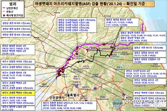 [아시아뉴스통신=홍근진 기자] 환경부는 국립환경과학원이 경기도 파주시 군내면 민통선 안에서 포획한 멧돼지에서 아프리카돼지열병(ASF) 바이러스가 검출됐다고 24일 밝혔다.