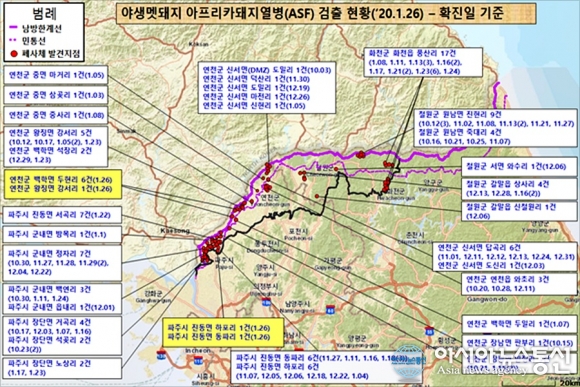 연천군과 파주시는 아프리카돼지열병 표준행동지침(SOP)에 따라 시료 채취 후 방역 조치와 함께 폐사체와 포획개체를 매몰 처리했다.
