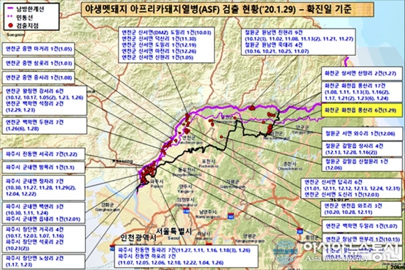[아시아뉴스통신=홍근진 기자] 환경부는 국립환경과학원이 강원도 화천군 화천읍 광역울타리 안에서 발견한 6마리의 멧돼지 폐사체에서 아프리카돼지열병(ASF) 바이러스가 검출됐다고 29일 밝혔다.