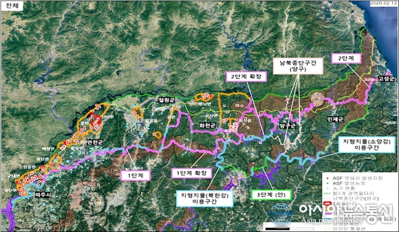 이에 따라 지난 10일 중수본은 화천-소양강-인제 구간을 연결하는 3단계 광역울타리를 설치하는 등 야생멧돼지 관리를 위한 추가 대책을 발표한 바 있다.