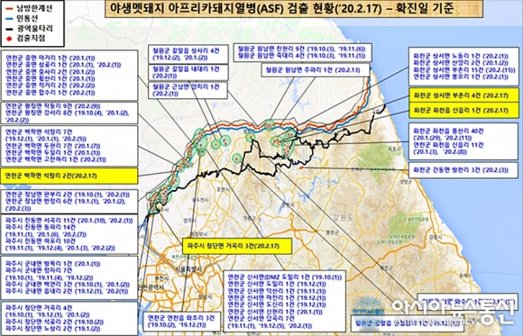 이로써 연천군 67건, 파주시 60건, 화천군에서는 78건의 야생멧돼지 아프리카돼지열병이 확진됐으며 전국적으로는 227건이 됐다.