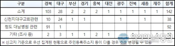 | 22일 확진환자 142명 중 130명이 신천지대구교회와 청도대남병원 환자로 밝혀졌다.(자료=질병본부) |