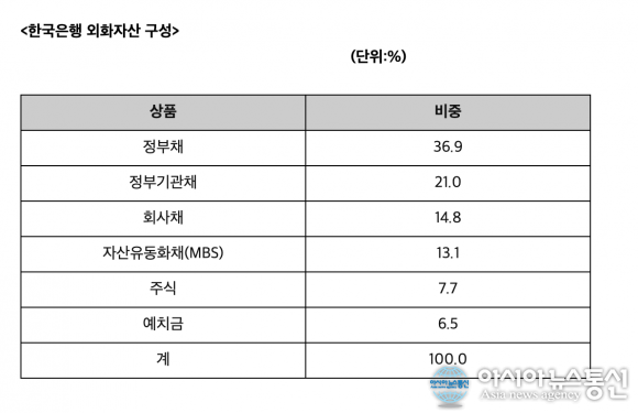 한국은행의 외환보유고 운용도 문제이다. 한국은행의 외화자산 구성을 보면 <국채 36%, 정부기관채 21%, 회사채 14%, 자산유동화채권(MBS) 13%, 주식 7.7%>이다. 회사채와 MBS는 부도 위험이 있는 위험자산이다.