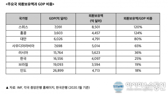 국가별 GDP대비 외환보유고 비중을 보면 스위스 120%, 홍콩 124%, 사우디아라비아 65%이다. 이들 국가는 한국보다 GDP가 작지만 외환보유고가 많다.