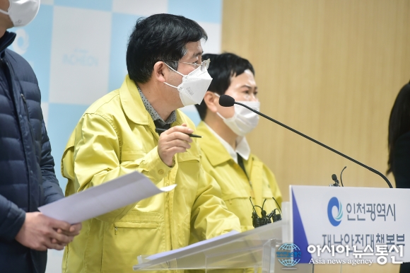 | 박규웅 인천시 건강체육국장의 인천시청 브리핑룸에서 기자회견 하고 있는 모습.(사진제공=인천시청) |