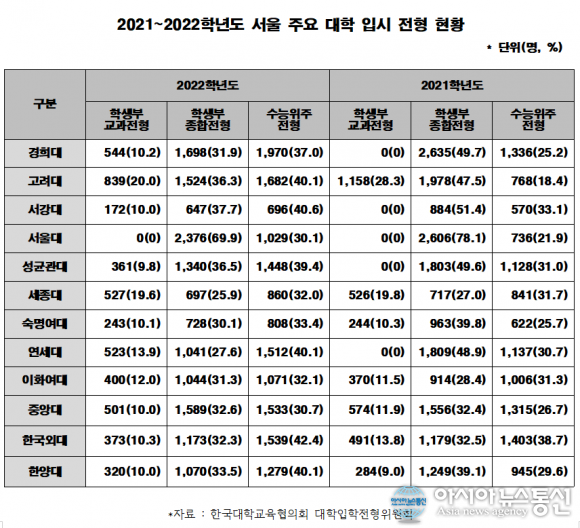[아시아뉴스통신=오지숙 기자] 2022학년도 대입에서 서울 주요 대학들을 중심으로 수능전형이 대폭 확대된다.