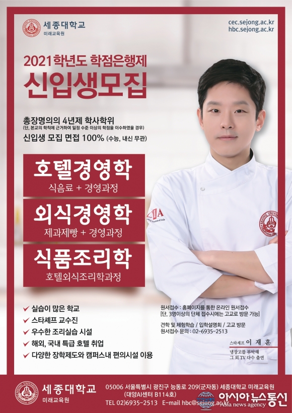 [아시아뉴스통신=오지숙 기자] 세종대학교(총장 배덕효) 미래교육원이 2021학년도 전기 신입생을 모집한다.