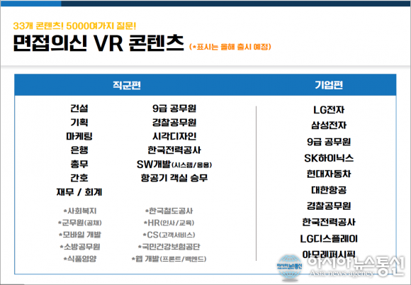 VR 면접은 VR 기계를 이용해 전·현직자 출신의 모의면접관이 10개 기업과 23개 직무에 맞춰 실전처럼 질문해 주는 프로그램이다.