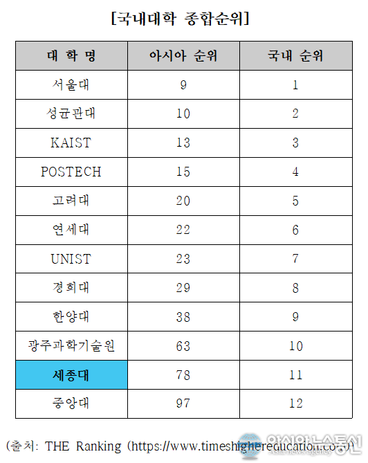 [아시아뉴스통신=오지숙 기자] 세종대학교(총장 배덕효)가 영국의 세계적인 대학평가기관인 THE가 발표한 2020 아시아 대학 평가에서 78위, 국내 11위에 올랐다.
