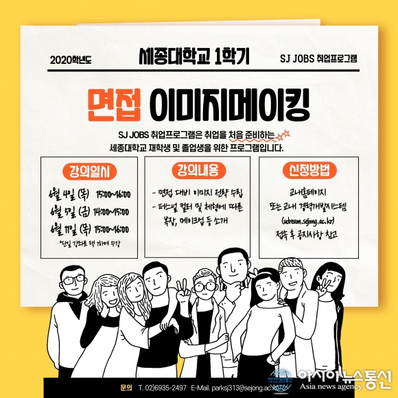 [아시아뉴스통신=오지숙 기자] 세종대학교(총장 배덕효) 취업지원과는 6월 4일부터 6월 11일까지 온라인 SJ JOBS 취업 프로그램 ‘면접 이미지메이킹’을 진행한다.