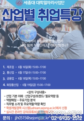 [아시아뉴스통신=오지숙 기자] 세종대학교(총장 배덕효) 대학일자리사업단은 6월 16일부터 6월 18일까지 ‘산업별 취업특강’을 진행한다.