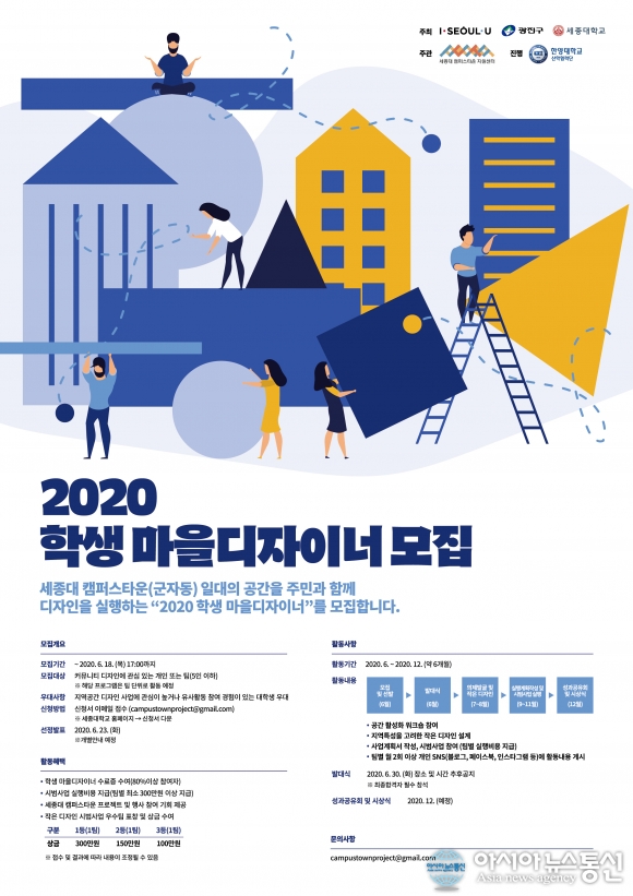 [아시아뉴스통신=오지숙 기자] 세종대학교(총장 배덕효) 캠퍼스타운은 ‘2020 학생 마을디자이너’를 모집한다.