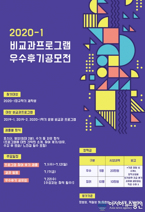 [아시아뉴스통신=김주은 기자] 세종대학교(배덕효총장) 비교과통합지원센터는 2020-1학기 비교과 프로그램 우수 후기 공모전을 개최한다.