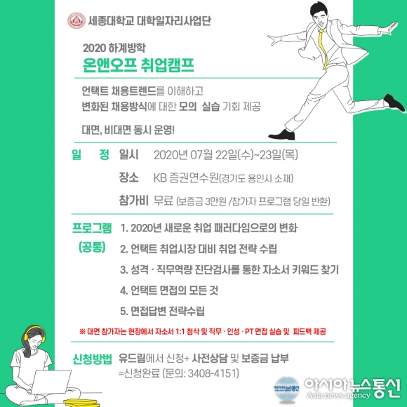 [아시아뉴스통신=오지숙 기자] 세종대학교(총장 배덕효) 대학일자리사업단은 6월 25일부터 7월 17일까지 ‘2020 하계방학 온앤오프 취업캠프’ 참가자를 모집한다.