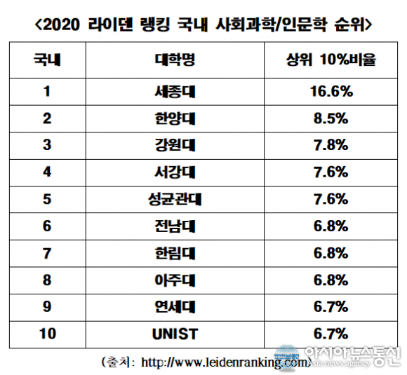 [아시아뉴스통신=최지혜 기자] 세종대학교(총장 배덕효)가 논문의 수준을 기반으로 세계대학순위를 선정하는 2020 라이덴랭킹“사회과학/인문학 순위에서 3년 연속 국내 1위에 올랐다”고 밝혔다.