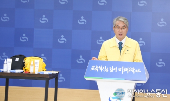 | 21일 박종훈 경남교육감이 경남교육청 브리핑룸에서 열린 기자회견에서 아이좋아 위생키트에 대해 설명하고 있다.(사진제공=경남교육청) |