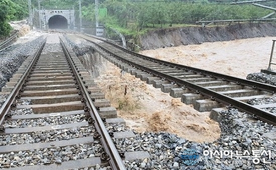 | 충북 충주 삼탄역 인근 충북선 철도 지반이 최근 내린 집중호우로 유실됐다.(사진제공=코레일) |