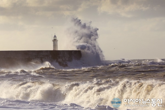 영국 뉴헤이원에 파도가 항구의 제방을 때리는 모습 26일/(신화통신/아시아뉴스통신=영국 장하준 기자)