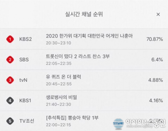 올레TV 실시간 채널 순위에서 '2020 대한민국 어게인 나훈아' 시청률이 70%를 넘겨 화제다.